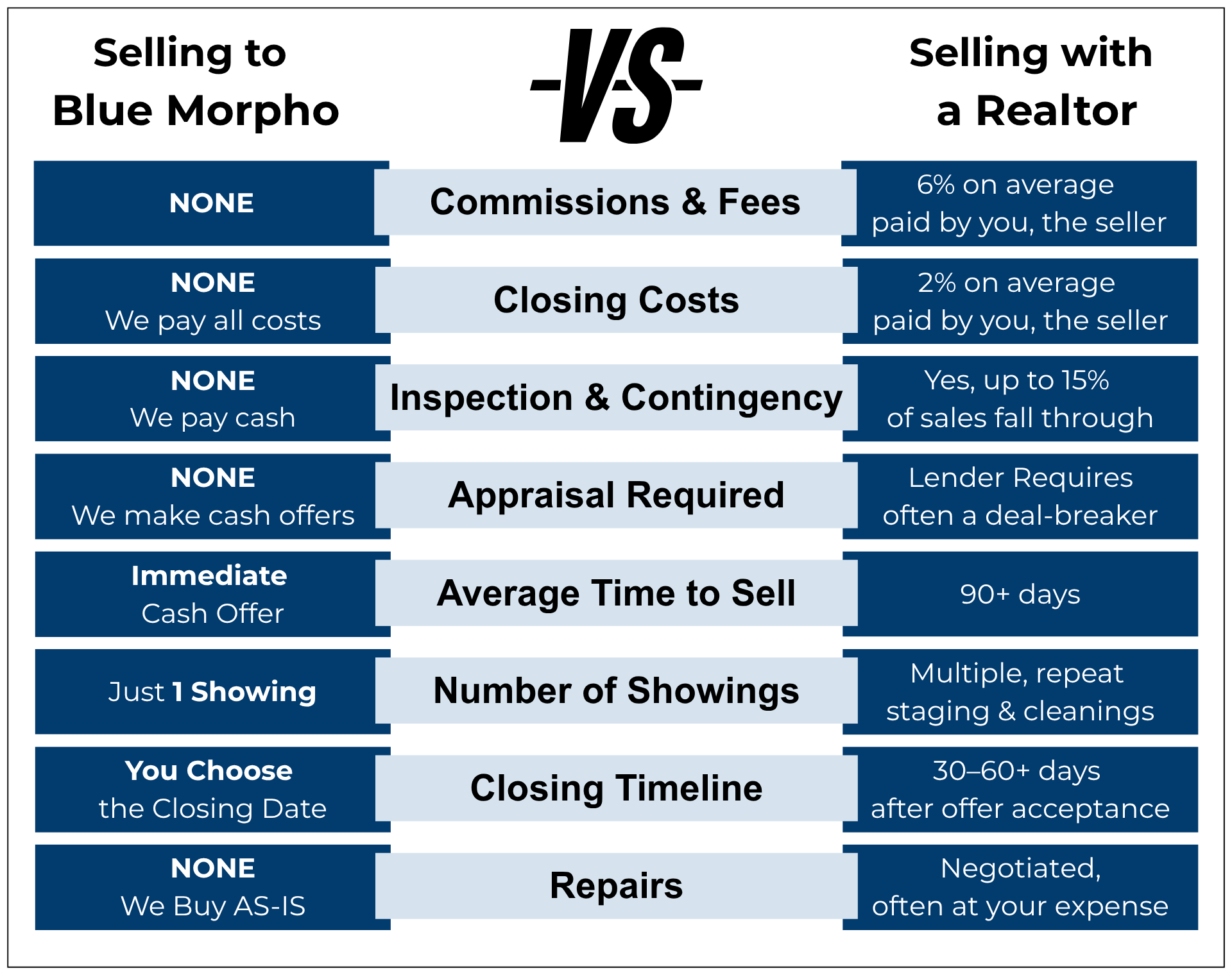 When it comes to selling your house, you have options. Many homeowners think their only choice is to list with an agent and wait months for a buyer. But working with Blue Morpho Property Solutions gives you another path — one that’s faster, simpler, and hassle-free.